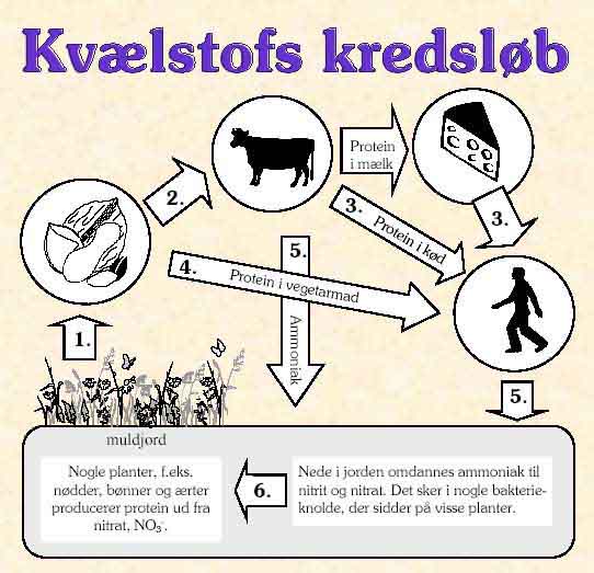 Grundstoffet nitrogen er et godt eksempel på et stofs kredsløb i naturen. Man kan næsten kalde det ”naturens eget genbrug”. Se forklaringen til illustrationen længere nede på siden.
