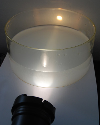 Vi sender hvidt lys gennem et kar med vand, hvor vi har kommet en lille smule mælk i. På den måde spredes lyset og laver en lidt rødlig lysplet, vores kunstige solnedgang.
