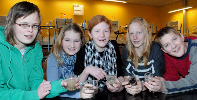 På billederne herunder ses det, hvordan vi har lavet forsøgene i 9. klasse. Vi tog nogle plastik-bægre og lavede 5 huller i bunden med en loddekolbe. Bægeret bliver sat op i et højt glas, og så måler man, hvor længe det tager 100 ml vand at sive igennem jordprøven.
