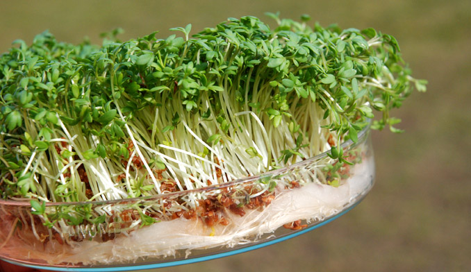 Det er nemt og sjovt at lave forsøg med karse. Efter en uge er spirerne meget store. |