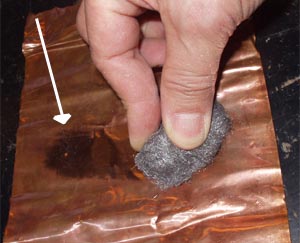- Prøv at pudse metallet med ståluld. Se det blanke område ved den hvide pil. Egner sig godt til kobber. I oldtiden brugte man faktisk spejle af kobber.