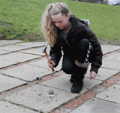 Vi skal prøve at lege håndværkere, der blander grus, cement og vand. Det minder lidt om sandkassen fra dengang du gik i børnehave. Nu skal vi bare have sand og grus til at beholde formen, selv om vi tramper på det. |