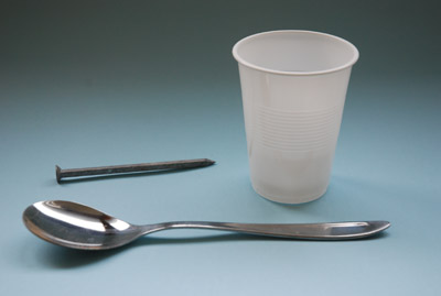 Du skal bruge et søm, en ske og et plastikkrus som redskaber.