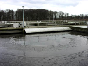 | Der er mange, store bassiner på et rensningsanlæg. I den kemiske rensning skal vandet stå stille.