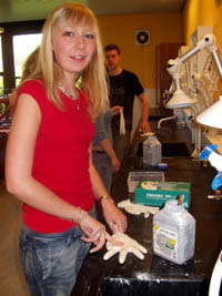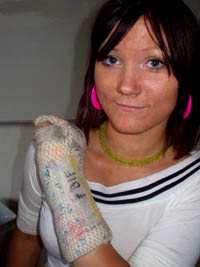 Stinne er i gang med at lave en gipshånd. Hun har glemt sikkerhedsbrillerne.   > > >
