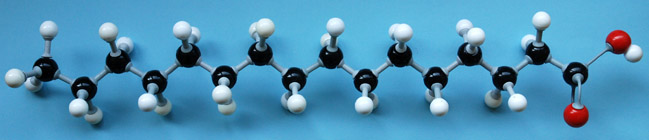 Fedtsyre bliver til et sæbemolekyle ved at brintatomet yderst til højre fjernes ved hjælp af natriumhydroxid.