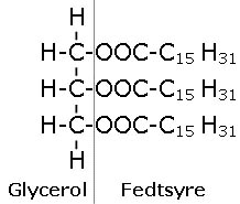 Lad os se på en strukturformel for et tilfældigt fedtstof. Til venstre er der glycerolmolekylet C3H5. Til højre de tre arme af fedtsyre.