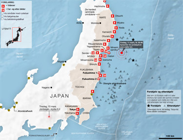 Den 11. marts ramte et stort jordskælv Japan. Faktisk var det mange jordskælv, som det ses af de små, grå trekanter i havet øst for Japan. Se kort >