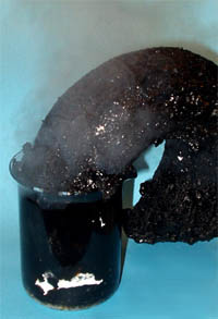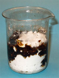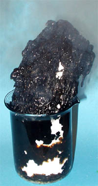 Når svovlsyren hældes ned i sukkeret, sker der hurtigt en reaktion. Syren finder sammen med brint og ilt, og der udvikles meget varme. Flormelisen skifter farve. > >