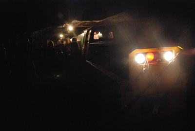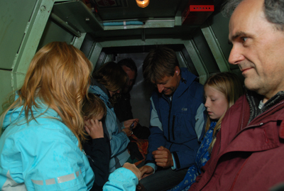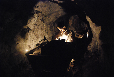 Foran os er der en 2,2 km lang tur i fuldstændig mørke. Det er ikke længere sommervarmt, for nede i jorden er temperaturen normalt mellem 6 og 8 gr Celsius. Derfor har vi klædt os fornuftigt på, selv om det er midt i sommerferien. |
